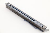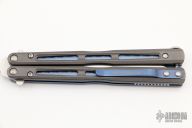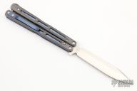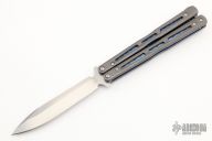 This Model 51 Morpho Balisong from Benchmade has a tumble finished D2 stainless steel spear point blade. Handle has anodized titanium scales by EDC Knives, with anodized and jeweled liners and matching clip. Comes with drawstring pouch, original scales, tube and maker card. Excellent condition.