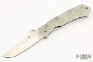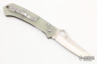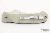 This Bob Lum designed folding knife by Spyderco features a tanto style blade marked with the Lum Logo, has HAP40/SUS420 San Mai blade steel. Stainless steel liners. Textured jade G-10 scales, tip up stainless steel clip. Comes with original box and papers. Nice detent, lockup and blade seating. Excellent condition.