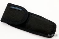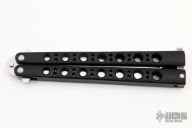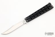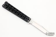 This Model 43 Bowie Balisong has a stonewashed 440C stainless steel clip point blade. Handle is textured/black coated titanium. Comes with nylon velcro sheath, and original box and paperwork. Excellent condition.
