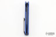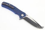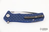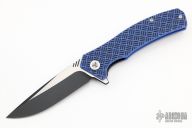 This knife features a black drop point blade with satin flats, a notched flipper and thumbrest. The handle features a textured blue/black G10 frame with a steel tip up pocket clip. Excellent Condition.