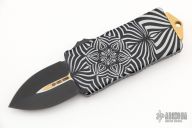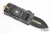 This Microtech Exocet features a stonewash double-edged blade. The handle has black aluminum handles with laser etched source artwork on both sides and a stainless clip that doubles as a money clip dated 12/2021 S/N 496. Gold accents on the hardware, thumb slide, and through lanyard hole. Comes with original box. Excellent condition.