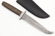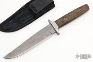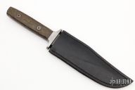 This Fighter by Reese Weiland features a bead blasted blade with .251" blade stock and 1.326" blade depth, full tang construction. The handle has a stainless steel guard with rag micarta scales. Comes with a black leather sheath. Excellent condition.