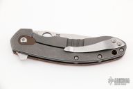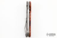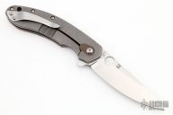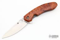 This Southard frame-lock flipper by Spyderco Knives features a stonewashed blade with a notched thumb-rest, thumb-hole, and flipper. The handle has a wood scale with a stonewashed titanium liner and titanium scale with brown G-10 around the pivot screw and a stainless steel clip, tip up carry. Excellent condition.