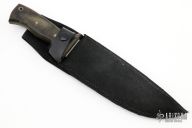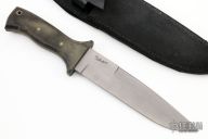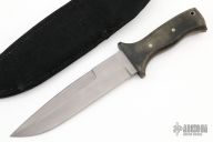 This Fighter by Dan E Brdlik features a double edged bead blasted blade with .229" blade stock and 1.472" blade depth, hidden/mortise tang construction. The handle has a black linen micarta grip, nickel silver pins and a lanyard hole. Comes with a black leather sheath. Has some light scuffs, otherwise excellent condition.