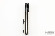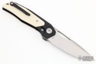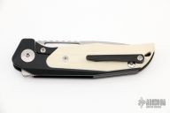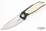 This GSD, by Liong Mah, features a satin finished blade with thumbhole, notched thumbrest and flipper. The handle is composed of a PVD coated titanium frame with ivory micarta scales, matching bead PVD coated titanium tip up clip and backspacer, lanyard pin in the butt. Nice detent, lockup and blade seating. Excellent condition.