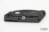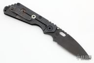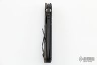 This SNG framelock folder by Mick Strider features a black blade and a dimple pattern black G-10 and flamed titanium frame and tip up titanium clip. Includes a Gray Precision Lockbar Stabilizer.   Nice detent, lockup and blade seating. Scratches are visible on the blade and handle otherwise the knife is in good condition.