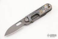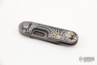 This Black Fox Bean was engraved by Tom Sterling, it features a tumble finished blade with thumbhole. The handle has a 440C stainless steel frame with a 420J2B stainless steel clip. The front is engraved with a "Steampunk Fish" and has 24kt gold inlays. Comes with original box and COA. New from Tom Sterling.