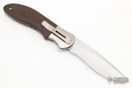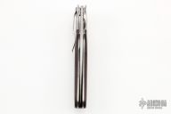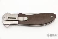This King Cobra linerlock flipper by the Late Phil Boguszewski features a hand rub satin finished blade with notched flipper. The handle has orange peel finished titanium bolsters, green canvas micarta scales, titanium liners with jeweled interiors, titanium tip down clip, black linen micarta backspacer. Smooth action, nice lockup, detent, and blade seating. Excellent fit and finish. Numbered 40 on the blade. Includes padded case. This rare piece is in excellent condition and shows no signs of use or carry. Excellent Condition.