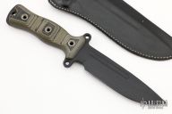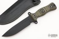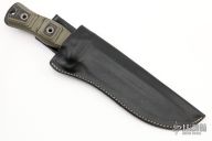 This Team Gemini "M" by Busse features a black coated drop point A2 blade with fullers, .263" blade stock and 1.582" blade depth, full tang construction. The handle has black/green G-10 scales, extended tang with lanyard hole. Comes with a custom leather sheath. Excellent condition.