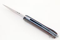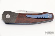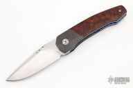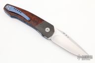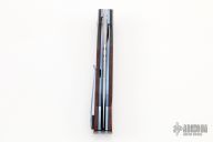 This linerlock flipper by John Arnold features a hand rub satin finished blade with notched flipper. The handle has carbon fiber bolsters, ironwood scales, anodized and jeweled titanium liners, carbon fiber backspacer with moonglow inserts, and an anodized titanium clip, tip up carry. Nice detent, lockup, and blade seating. Features IKBS. Has some scuffs and scratches, great condition otherwise.