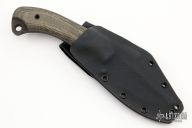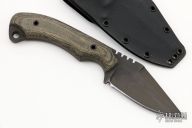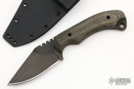 This knife by MMHW features a black blade with notched thumbrest and false top edge, full tang construction, .211" blade stock and 1.420" blade depth, full tang construction. The handle has black canvas micarta scales with lanyard hole. Comes with kydex sheath. Has some light scuffs, otherwise excellent condition.