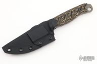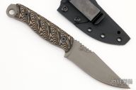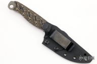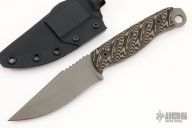This Crow Jr by Half Face Blades features a cerakote blade with a notched thumbrest, .142" blade stock, 1.243" blade depth, full tang construction.  The handle has black and coyote brown G-10 scales.  Comes with a kydex sheath with clip, and original box. Excellent Condition.