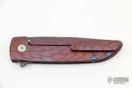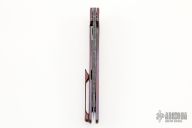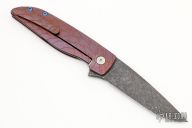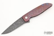 This Rask by John Grimsmo of Grimsmo Knives features an acid etched and tumble finished blade with notched flipper. The handle has a streamline milled, anodized and tumbled titanium frame with matching tip up clip that has hidden screws, anodized titanium barrel spacers and screws. Numbered #1157 on the spine of the blade. Includes original box and COA dated June 21, 2022. Excellent condition.