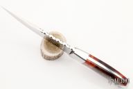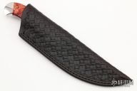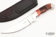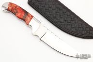 This Hunter from Joe DeWitt features a mirror polished blade with fileworked spine, .192" blade stock and 1.359" blade depth, full tapered tang construction. The handle has stainless steel dovetailed bolsters and dyed maple burl wood scales with black liners. Comes with a zippered case and hand tooled black leather sheath. Excellent condition.