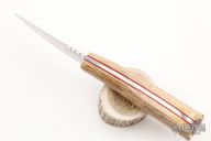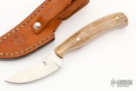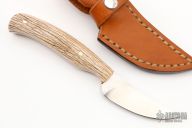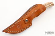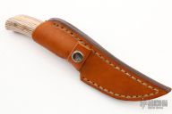 This knife by Jim Ort features a satin finished blade with notched thumbrest and tang construction, .107" Blade Stock, .906" Blade Depth.  The handle has giraffe bone scales and red liners.  Includes a brown leather sheath.  Excellent Condition.