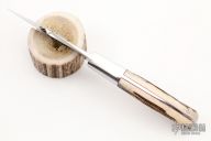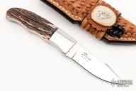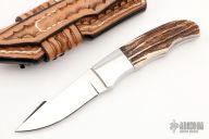 This knife by D'Alton Holder features a mirror polished blade, .130" blade stock and .832" blade depth, full tapered tang construction. The handle has mirror polished stainless steel bolsters, stag scales with thin red liners. Comes with brown leather sheath and zippered case. Has some light scratches, otherwise excellent condition.