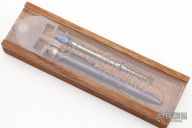 This Custom Saga pen from Grimsmo features titanium components, tumbled tube anodized. Custom made wooden case and extra ink insert included. Excellent condition.