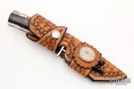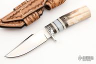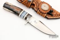 This Mitchell's Clip by D'Alton Holder features a mirror polished clip point blade with a false top edge, .168" blade stock and 1.230" blade depth, hidden tang construction. The handle has an engraved nickel silver guard by Pat Holder, beautiful walrus ivory handle with black, nickel silver, prehistoric rhino bone, oosic, and mother of pearl spacers. Very nicely contoured handle, very comfortable in hand. Comes with a brown leather sheath and zippered case. Excellent condition.