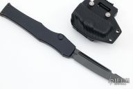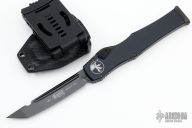 This Halo VI by Microtech knives features a DLC tanto blade with fullers. The handle has a black aluminum frame with black stainless steel hardware and charging handle. Dated 01/2019 and s/n 2696. Comes with original box and papers, kydex sheath and tek-lok. Has a little wear on the frame edges, otherwise excellent condition.