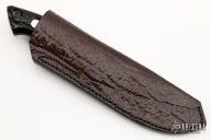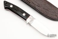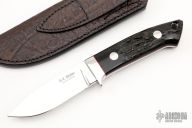 This hunter by Robert Brown features a mirror polished drop point blade with .192" blade stock and 1.063" blade depth, full tapered tang construction. The handle has stainless steel guard/bolsters and cape buffalo scales. Comes with a brown leather sheath. Has a couple light scratches, otherwise excellent condition. #1692