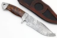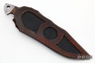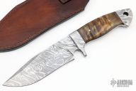 This Knife by SMID Damascus features a Damascus blade with false top edge, .185" blade stock and 1.799" blade depth, integral guard and butt with sheep horn scales. Comes with a brown leather sheath with black textured leather inlays. New from maker.