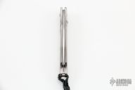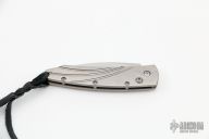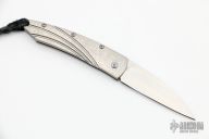 This side opening auto by William Henry Fine Knives features a hand rub satin finished blade. The handle has a stippled titanium frame with push button, push button and pivot have a sapphire stone set in a gold bezel. Fast action and strong lock up. Includes original box, COA and leather sheath. Excellent Condition.