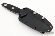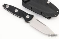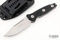 This Mini Socom Alpha by Microtech features a stonewashed clip point blade with a notched thumb ramp and a full tang construction. .169" Blade Stock. 1.178" Blade Depth. The handle features black G10 scales. Includes a kydex sheath, original box and papers. Excellent Condition. Dated 01/2022 and #2603