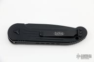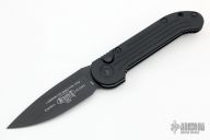 This LUDT side opening automatic by Microtech has a black blade with a standard edge and a black aluminum frame. This tactical version has black fittings. Stainless steel clip. Dated 02/2022 and serial number 26111. Comes with original box and sheath. Excellent condition.