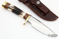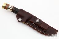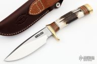The Model 25-5 by Randall Made Knives is a drop point hunter similar to Model 11, but handle construction is reminiscent of 1930′s design. Excellent skinning, outdoors knife. This knife has a carbon steel blade with notched thumbrest, .201" blade stock and 1.345" blade depth, hidden tang construction. The handle brass guard and pommel, stag grip with stacked leather, black and brass spacers. Comes with brown leather sheath. Excellent condition. Comes with original paper wrapping.
