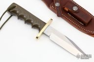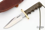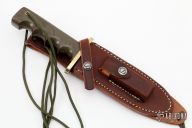 This Model 15 Airman by Randall Made Knives features a clip point blade with a sharpened top edge, .217" stock. 1.279" blade depth, full tang construction. The handle has green linen micarta handle with finger grips and a brass guard. The Model 15 is designed especially for heavy-duty use and to be as nearly indestructible as possible. Comes with a brown leather sheath. Excellent condition. Comes with original paper wrapping.