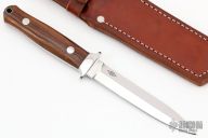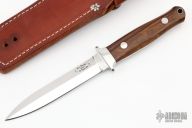 This Loveless Style Dagger by Bob Dozier features a hand ground mirror polished blade with false top edge, .175" blade stock and .826" blade depth, full tapered tang construction. This knife was hand ground and made solely by Bob Dozier. The handle has a stainless steel guard, desert ironwood scales. Has lanyard hole at the butt. Comes with a brown leather sheath. Excellent condition.