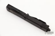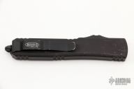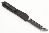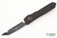 This Ultratech OTF automatic by Microtech features a T/E black tanto blade. Black aluminum contoured frame with all black hardware. Dated 04/2022. Has scuffs and scratches, has been used, otherwise good user condition. Tip down carry with glass breaker.