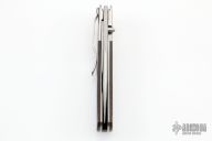 This Classic flipper from Phil Boguszewski features a hand rub satin finished blade with single thumbstud and a notched flipper. The handle has jeweled titanium liners along with green canvas micarta scales, orange peel finished titanium bolsters, and a satin finished pocket clip that is positioned for tip down carry. The backspacer is black linen micarta. The blade is centered when closed. Flips like you'd expect a Boguszewski to flip- effortlessly! Locks up with no play and has nice crisp detent. This rare piece is in excellent condition and shows no signs of use or carry. Comes in a Velcro case.