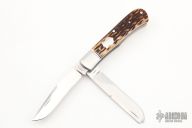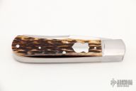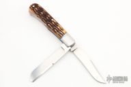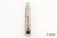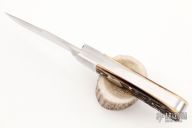 This Two-Blade Trapper by Tommy Overeynder features 2 hand rubbed satin finished blades with nail nicks. The handle has stainless steel fluted bolsters with integral liners, stainless steel springs, jigged covers with stainless steel pins and escutcheon. Has half-stops and springs are flush at all positions. Comes with a zippered case. Excellent condition.