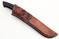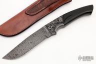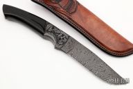 This Knife by Csaba Vojko features a hand forged high contrast Damascus blade (K720 tool steel and 75Ni8), .180" blade stock and 1.317" blade depth, hidden tang construction. The handle has integral engraved bolsters, and a beautiful black buffalo horn grip. Comes with a hand tooled brown leather sheath with matching theme. New from maker! As with all his work, this knife is Sole-Authorship and an extremely well crafted work of functional art. Comes with a zippered case.