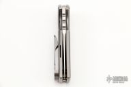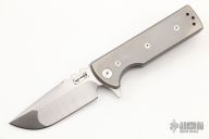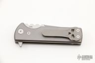 This Chaves T.A.K. features a satin finished drop point blade with the Chaves logo and a notched thumbrest. The handle has a stonewashed titanium frame and a matching reversible skull pocket clip. Includes the original box and a plain titanium pocket clip.  New From Maker!
