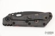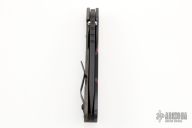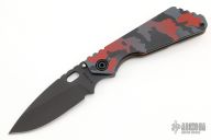 This SMF by Mick Strider features a black blade with thumb hole and notched thumbrest. The handle is comprised of a black/red/gray camo coated aluminum and flamed titanium with matching titanium clip and Hinderer "Lock Bar Stabilizer" for maximum reverse lock retention. New condition.