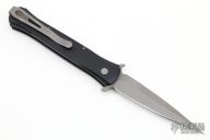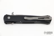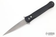 This Don by Pro-Tech features a bead blasted blade with false top edge. The handle has a 3D pattern pattern engraved from the center of the black aluminum frame. Comes with original box and papers. PR6 s/n 249. Has a few scuffs, otherwise excellent condition.