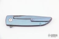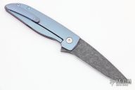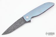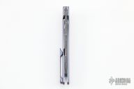 This Rask by John Grimsmo of Grimsmo Knives features an acid etched and tumble finished blade with notched flipper. The handle has a streamline milled, turquoise with pink flakes anodized and tumbled titanium frame with matching tip up clip that has hidden screws, anodized titanium barrel spacers and screws. Numbered #1197 on the spine of the blade. Includes original shipping box, hard case and COA dated August 17, 2022. New condition.
