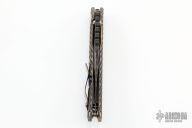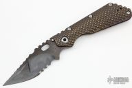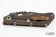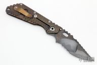 This Mick Strider custom Rhino XL framelock folder has a hand ground belly Nightmare recurve blade with notched thumbrest and thumbhole. Bronze-Infused Magma Splattered Flats with San-Mai STYLE Hamon. The handle has a double gunner grip titanium frame with anodize and orange peel titanium clip. Includes Hinderer "Lock Bar Stabilizer" for maximum reverse lock retention. Nice lockup, blade seating and detent. Comes with zippered case. Has a couple light scratches on the clip. Excellent condition otherwise.