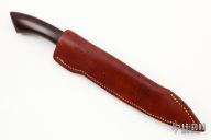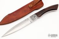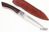 This Fighter by Dick Atkinson has a hand rub satin finished double edged blade with .250" blade stock, 1.136" depth, full tang construction. The handle has engraved and dovetailed stainless steel bolsters, ironwood scales with red liners. Comes with a brown leather sheath. Has a couple small oxidation spots on the blade, otherwise excellent condition.