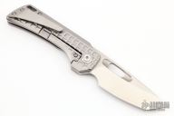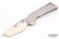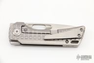 This Nymble Framelock Flipper by EMP EDC features a stonewashed blade with notched thumbrest and flipper, and a thumbhole. The handle has a tumbled and frag pattern milled titanium frame, titanium backspacer and tip up clip. Comes with original box. Rides on bearings, nice detent, lockup and blade seating.  Excellent condition.