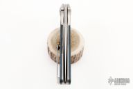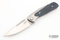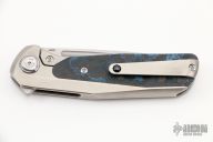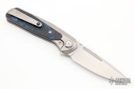 This GSD, by Liong Mah, features a satin finished blade with a notched thumbrest and flipper. The handle is composed of a orange peel finished titanium frame with fat carbon scales and a titanium tip up pocket clip.  Nice detent, lockup and blade seating. Includes a padded zippered case.  Excellent condition.