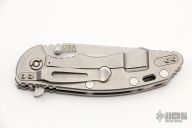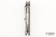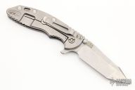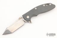 This 3.5" Harpoon Tanto ground FATTY XM-18 from Rick Hinderer features a tumble finished, .186" thick blade with notched thumbrest, dual thumb studs and flipper. The handle is comprised of a gray G-10 "A" side and a bronzed titanium lockside with matching tip up/tip down clip and filler tab. This is an XM-18 built on XM-24 hardware. A thick beast of a knife! Great blade seating, detent and lock up. Excellent condition. Comes with original box.