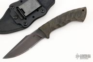 This Pathfinder by Winkler Knives is a Jason Knight design, it features a black Caswell finished blade with notched thumbrest, .190" blade stock and 1.332" blade depth, full tapered tang construction. The handle has a sculpted black canvas micarta scales. Comes with a black leather sheath, original box and papers. Excellent condition.
