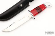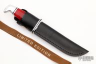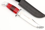This Model 119 by Buck Knives features a satin finished clip point blade with false top edge and fullers, .172" blade stock and 1.096" blade depth, hidden tang construction. The handle has an aluminum guard and butt, and a black/red lucite grip. Comes with original black leather sheath, wooden box and papers. Excellent condition.