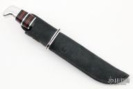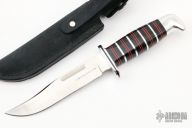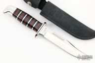 This Model 119 by Buck Knives features a satin finished clip point blade with false top edge and fullers, .172" blade stock and 1.096" blade depth, hidden tang construction. The handle has an aluminum guard and butt, and a black micarta grip with red and aluminum spacers. Comes with original black leather sheath, wooden box and papers. Excellent condition.