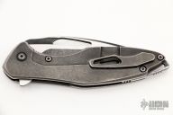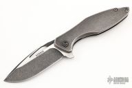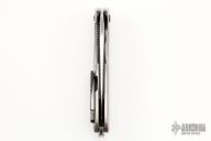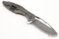 This Arius by Koenig knives features a heavy tumble finished blade with thumbhole and flipper. The handle has a milled and heavy tumble finished titanium frame with matching tip up clip and titanium backspacer. Has ceramic bearings and a ceramic detent ball. Nice detent, lockup and blade seating. Excellent condition. This knife was refinished by Glenn Are Hovin with his "Tumble Ice" finish.