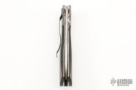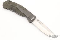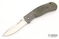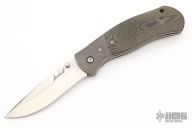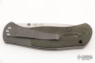 The LDC-107 was David Broadwell's first tactical series.  This knife features a satin finished drop point blade with a single knurled thumb stud.  The handle features bead blasted titanium bolsters, green micarta scales and tip down titanium pocket clip.  Satin finished titanium liners.  Nice detent, lock up and blade seating.  Scratches are visible on the frame otherwise the knife is in good condition.