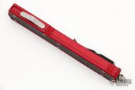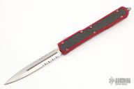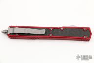 This Makora II OTF automatic features a satin finished double edge partially serrated blade.  The handle features a red aluminum frame with textured carbon fiber inserts, a bead blasted stainless steel clip and glass breaker. Dated 11/2014 with a S/N of 05053. Comes with original box and papers. Excellent condition.
